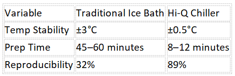 Традиційні крижані ванни проти HI-Q Системи:Традиційні крижані ванни створюють нерівні температурні зони (поверхня: 0 ° C; дно: 8 ° C), що призводить до непослідовних результатів. Вихідний циркуляція Hi-Q забезпечує однорідну температуру води, що дозволяє: